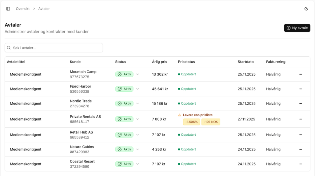 - ✅ Smart indeksregulering: Hele prislisten justeres med ett tastetrykk – systemet varsler om avvik.